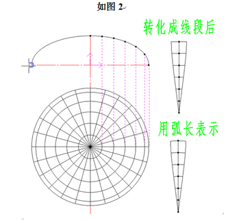 ⑸ 在所作的若干圆上截取相应的同心圆弧的长度,为了下料方便,把弧长转化成线段的长度,按顺序分别添加到素线的等分点上,如图2。